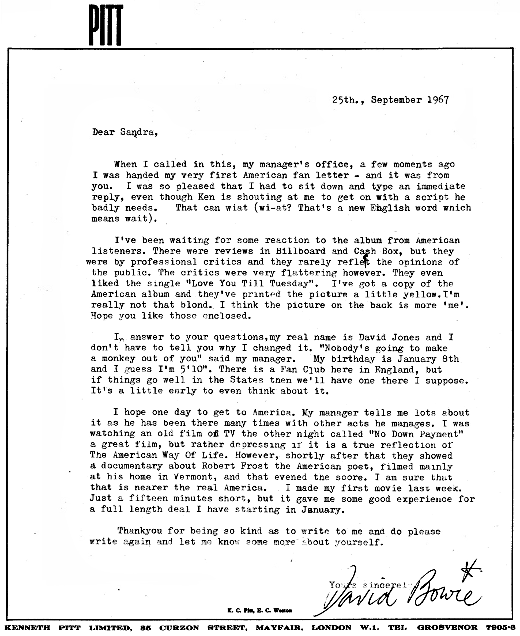 "My Real Name is David Jones" Bowie's reply to 1st US fan letter in 1967 is wonderful