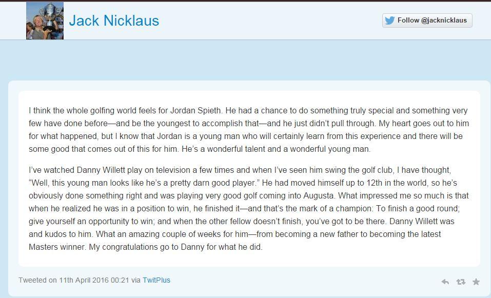 Jack Nicklaus tweeted a heartfelt message to Jordan Spieth after he lost The Masters. (via